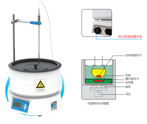 ● 可以用作水浴或油浴,浴槽内设强磁力搅拌。